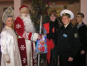 На знімку: Діда Мороза та Снігуроньку зустрічає чергова зміна на чолі з капітаном 3-го рангу Мирославом Ржевським; напередодні свят до Західної військово-морської бази ВМС України завітали незвичайні гості – Дід Мороз, Снігуронька, Баба Яга і Лісовик.