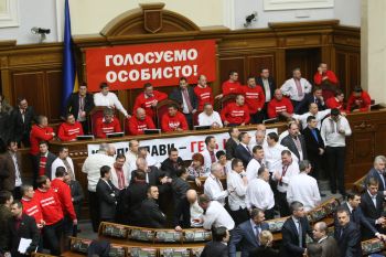 Як заявив журналістам Голова Комітету з питань Регламенту, депутатської етики та забезпечення діяльності Верховної Ради України Володимир Макеєнко, представники фракцій «Батьківщина», «УДАР» та ВО «Свобода» продовжують блокувати трибуну попри те, що більшість має достатню кількість депутатів для прийняття рішень шляхом особистого голосування.