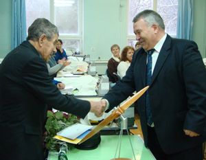 На знімку: Генеральний директор Державного підприємства «Одеський авіаційний завод», кандидат технічних наук, заслужений машинобудівник України Віталій Юхачов та колектив заводу щиро вітають з виходом на заслужену пенсію ветерана Великої Вітчизняної війни, полковника у відставці 92-річного Василя Андрійовича Ямскова; представник трудової династії слюсар-механік 5 розряду, багаторазовий переможець заводських змагань, кавалер ордена Трудової Слави III ступеня Володимир Русавський.
