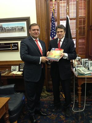 Также состоялась встреча делегации Харьковской области с госсекретарем штата Техас Джоном Стином и губернатором штата Риком Перри. В ходе встречи с губернатором речь шла о нескольких аспектах возможного сотрудничества Харьковской области и Техаса. В частности, обсуждалось сотрудничество в сельском хозяйстве. Штат Техас благодаря использованию новых технологий и наработок Техасского университета сельского хозяйства и механики занимает первое место в США по производству говядины. Этим опытом техасцы готовы поделиться с Харьковской областью. Сообщается, что Рик Перри отдал распоряжение изучить возможность сотрудничества в подготовке сельхоз- специалистов из Харьковской области. Для этого будет использован опыт преподавателей Техасского университета сельского хозяйства и механики – одного из лучших вузов сельскохозяйственного профиля в США.